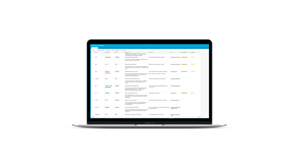 This list is for you! This list doesn't contain 200+ tools, but it contains the ones I truly believe are worth using and is still comprehensive enough to cover all the use cases you might have. The Say Yes to No Code list is hosted in Airtable, allowing you to sort it by use case, pricing model or my personal rating, and gives you the information about each tool at a quick glance.